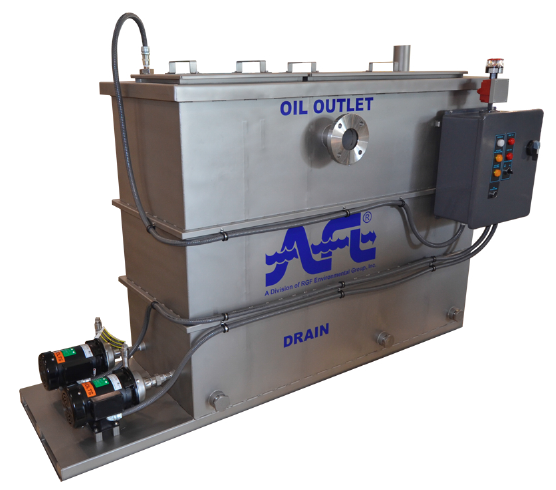 - CVF Series – The CVF removes free hydrocarbons and settleable solids from industrial waste water and coolant. in operation, the CVF accepts industrial liquid waste in the inlet chamber where settleable solids fall to the bottom as sludge for periodic removal. The waste stream then enters the coalescing separation chamber where AFL’s Delta-Tubes inspire laminar flow characteristics to the liquid as it passes through the separator. The result is a liquid more responsive to gravity separation. Floating oil is collected by a Rotary Pipe Skimmer for collections and disposal in accordance with local regulations.